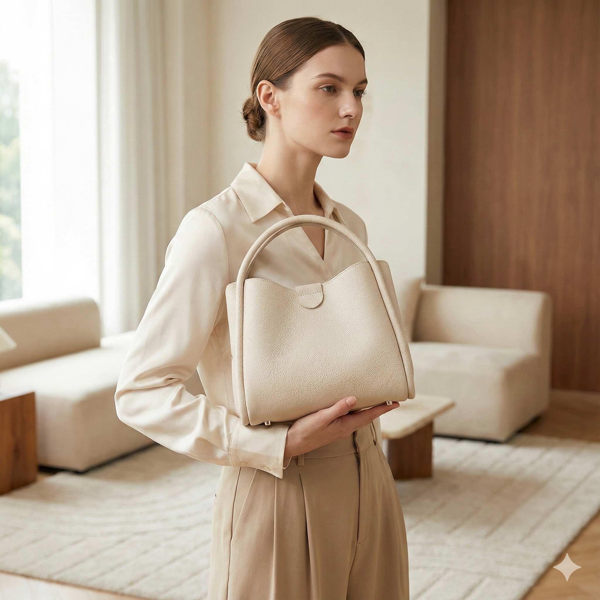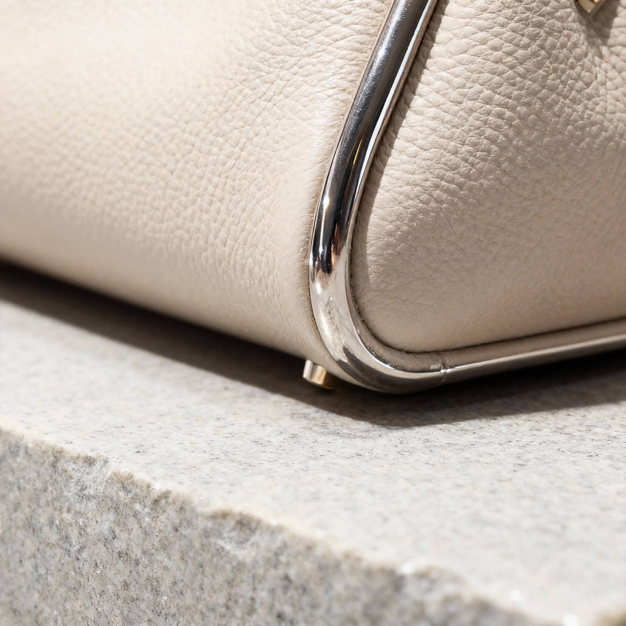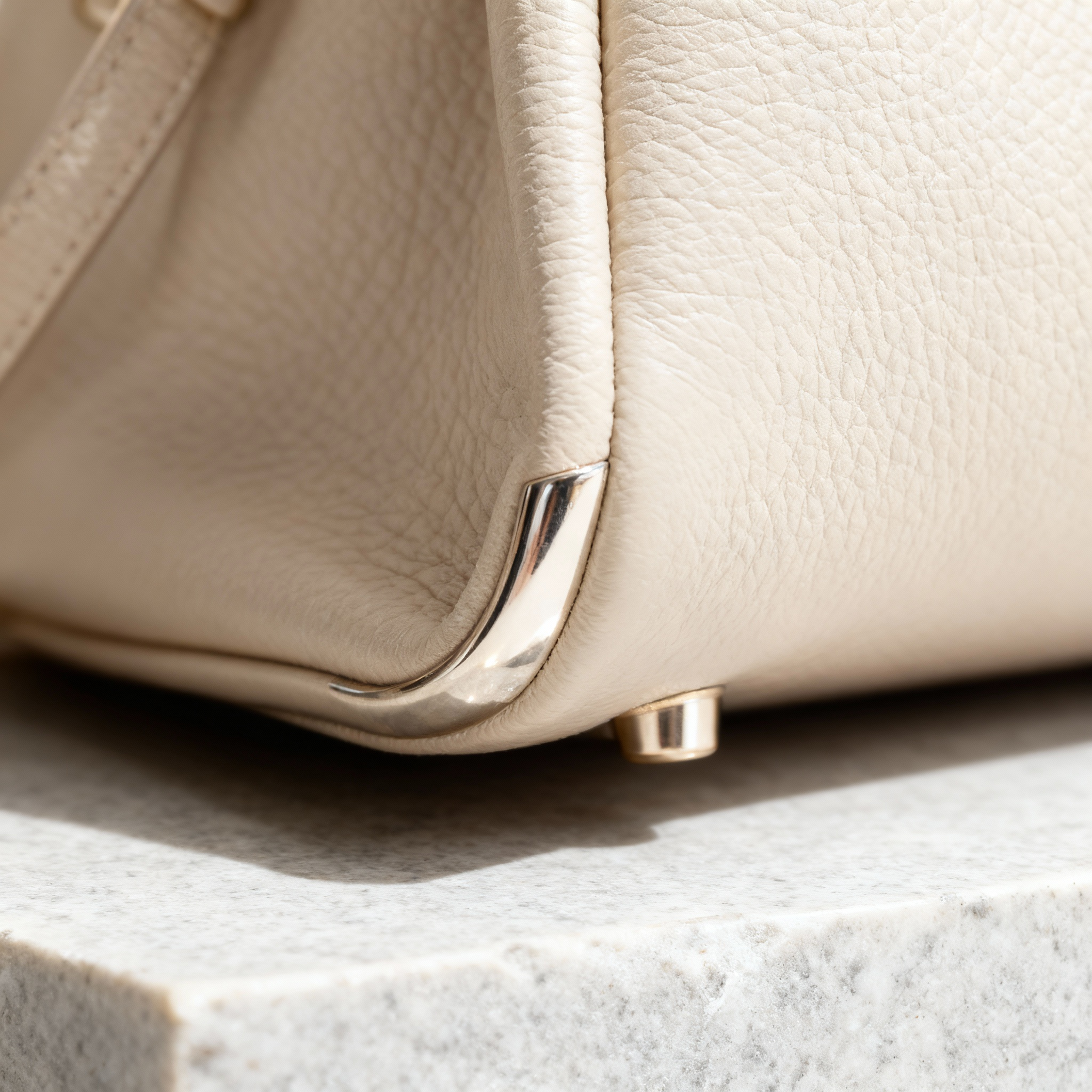 Exude sophistication with this stunning cream handbag, crafted from high-quality pebbled leather for a luxurious texture and durable finish. The structured design features a graceful arched top handle for a classic look, along with a detachable and adjustable strap that allows for comfortable crossbody or shoulder wear. Protective gold-tone metal feet at the base ensure the bag stays pristine and stands upright when placed down. Its minimalist aesthetic and neutral tone make it a versatile accessory, perfect for elevating professional attire or adding a polished touch to weekend outfits.