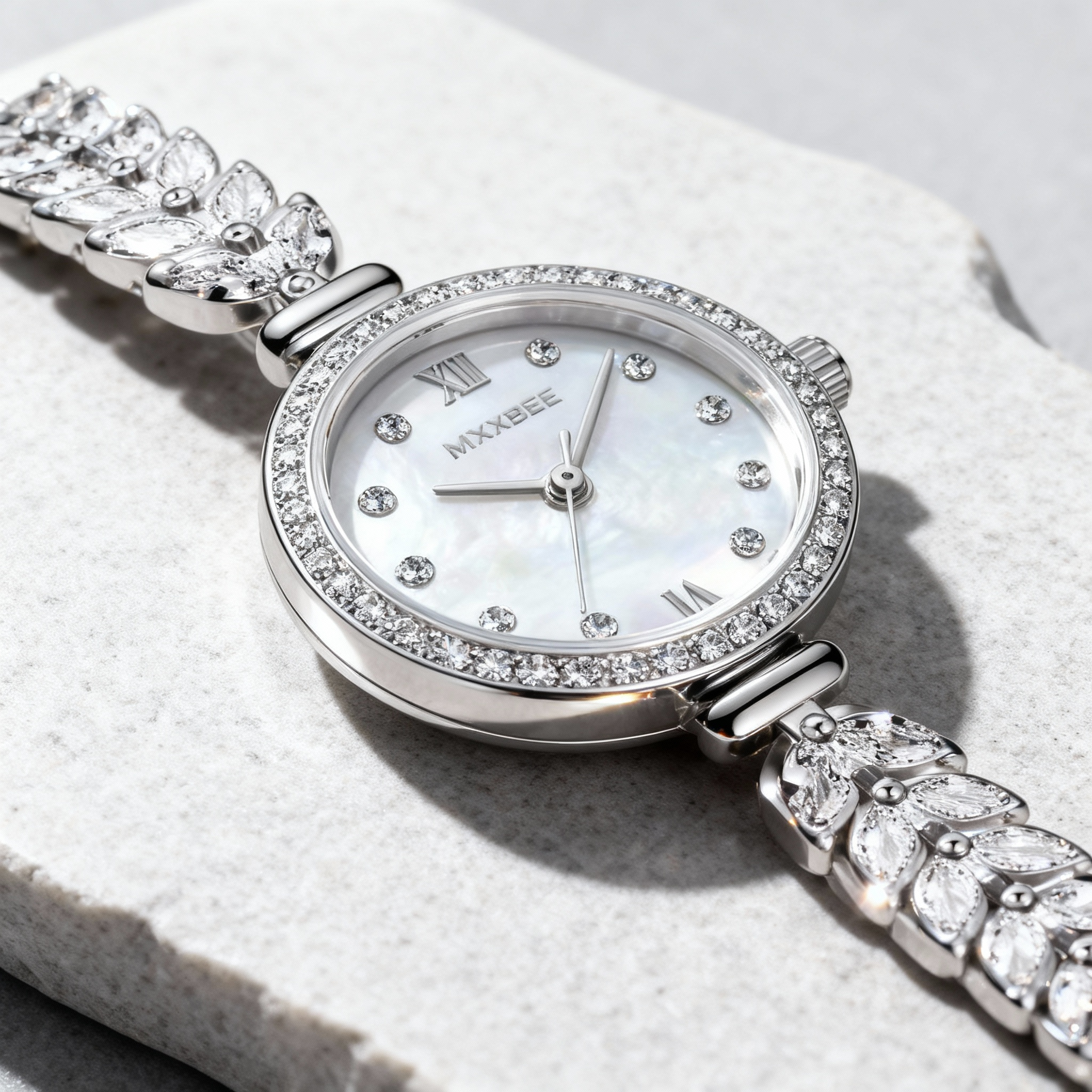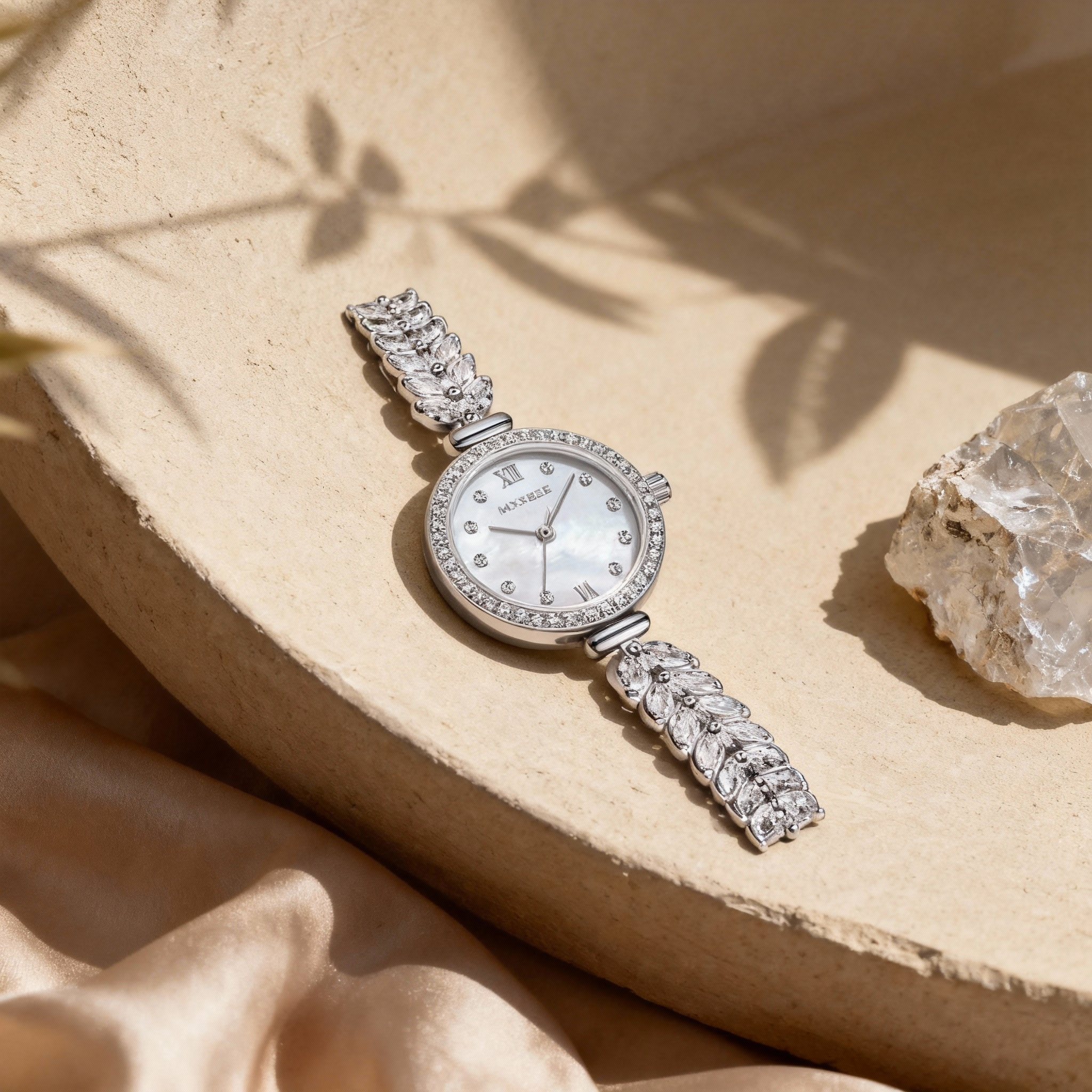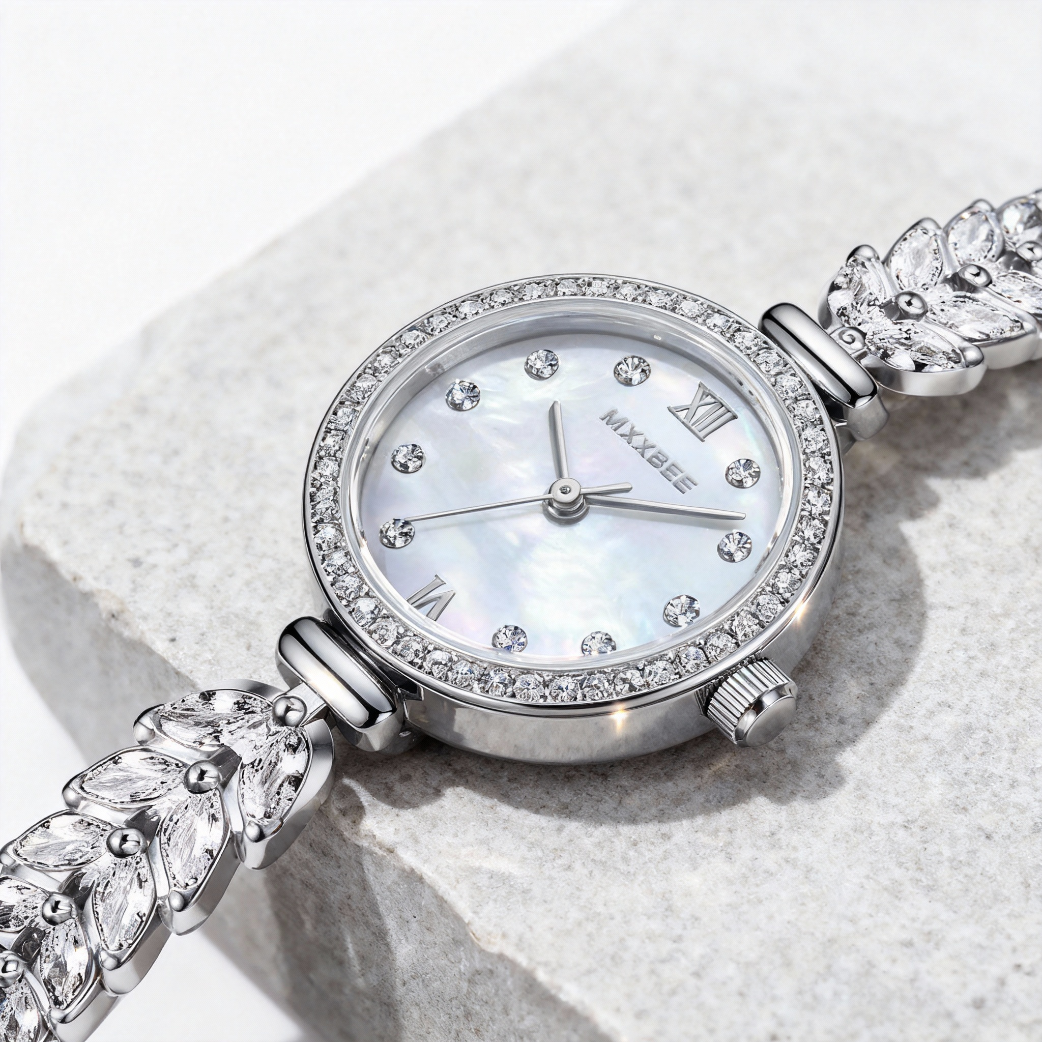 Enhance your wrist with this luxurious silver-tone watch that functions like a piece of fine jewelry. The lustrous mother-of-pearl dial is encircled by a halo of glittering stones, while the unique bracelet strap features marquise crystals arranged in a graceful wheat-ear pattern. Ideal for weddings and formal events, this timepiece offers a dazzling combination of precision and elegance, ensuring you sparkle at every second.