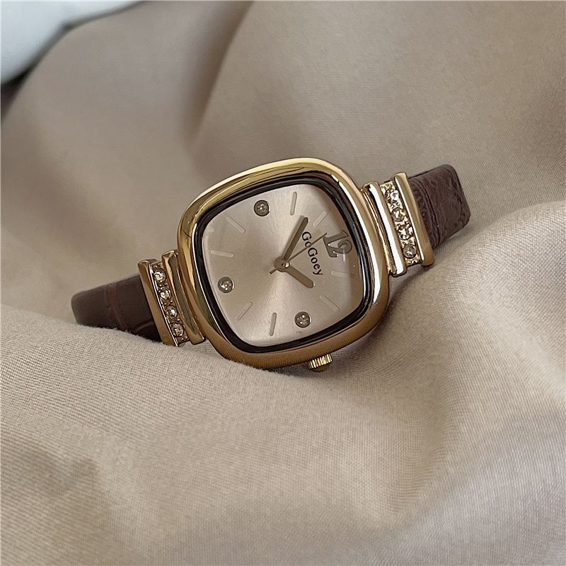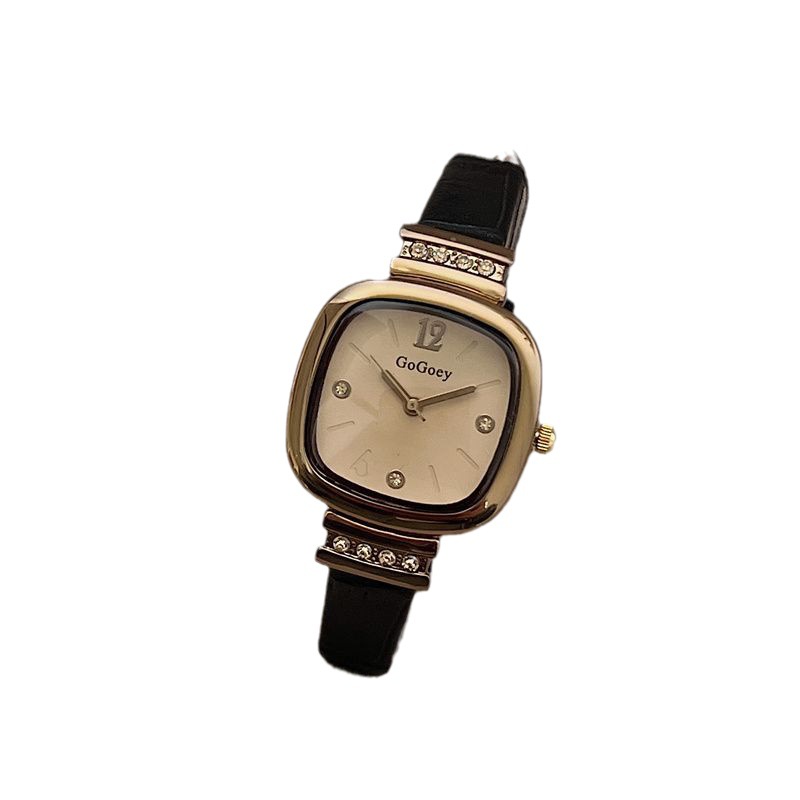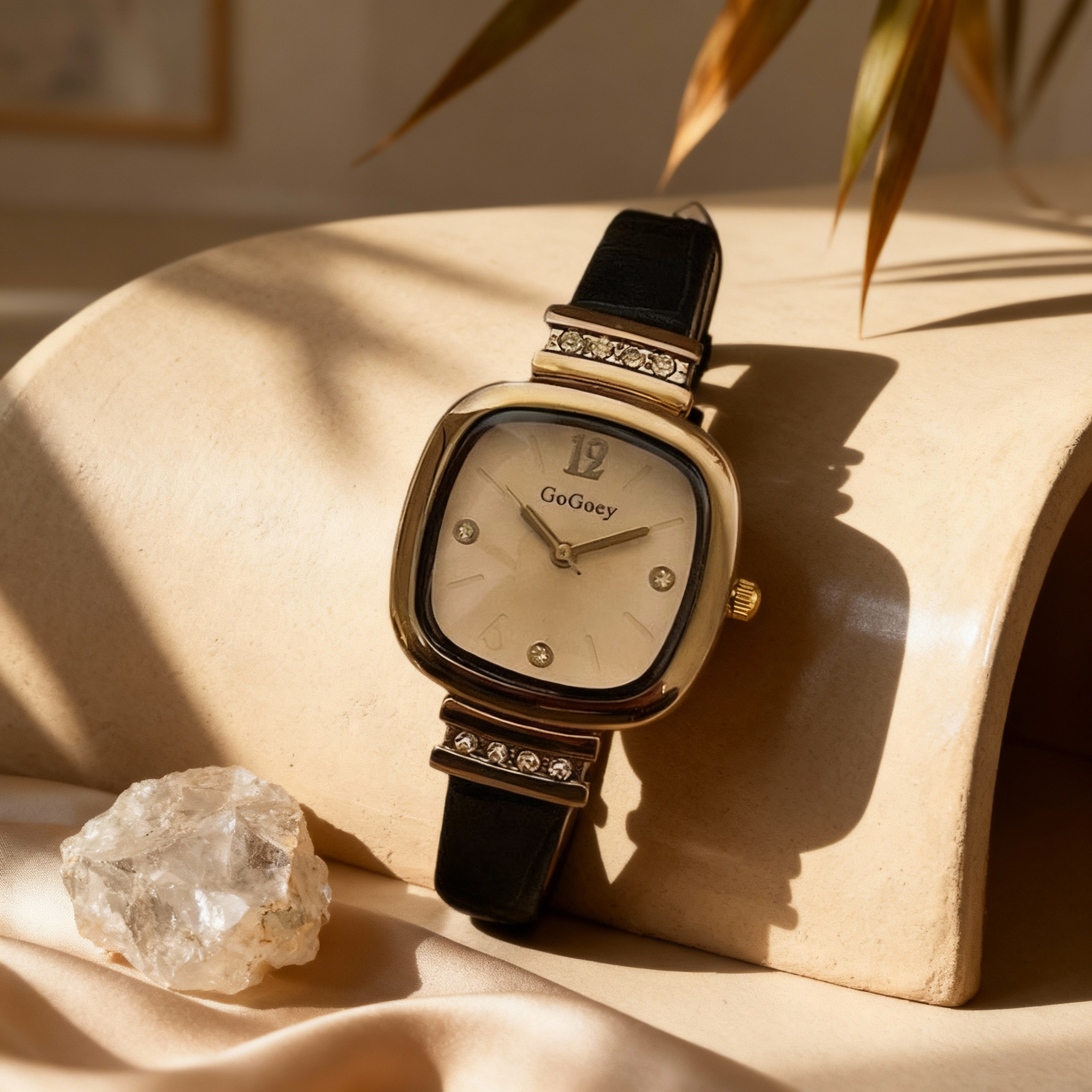 Add a touch of vintage glamour to your wrist with this sophisticated timepiece. The watch features a classic cushion-shaped gold-tone case, elegantly connected to a textured black strap by lugs embedded with sparkling crystals. The minimalist dial is accented with a prominent “12” and subtle stone markers, creating a look that is both timeless and refined. Perfect for daily wear or special evenings, this watch blends functionality with jewelry-like charm.
